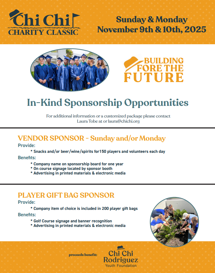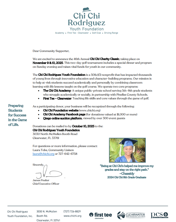 Donations can be mailed to October 10, 2025 to the: Chi Chi Rodriguez Youth Foundation 3030 North McMullen Booth Road Clearwater, FL 33761